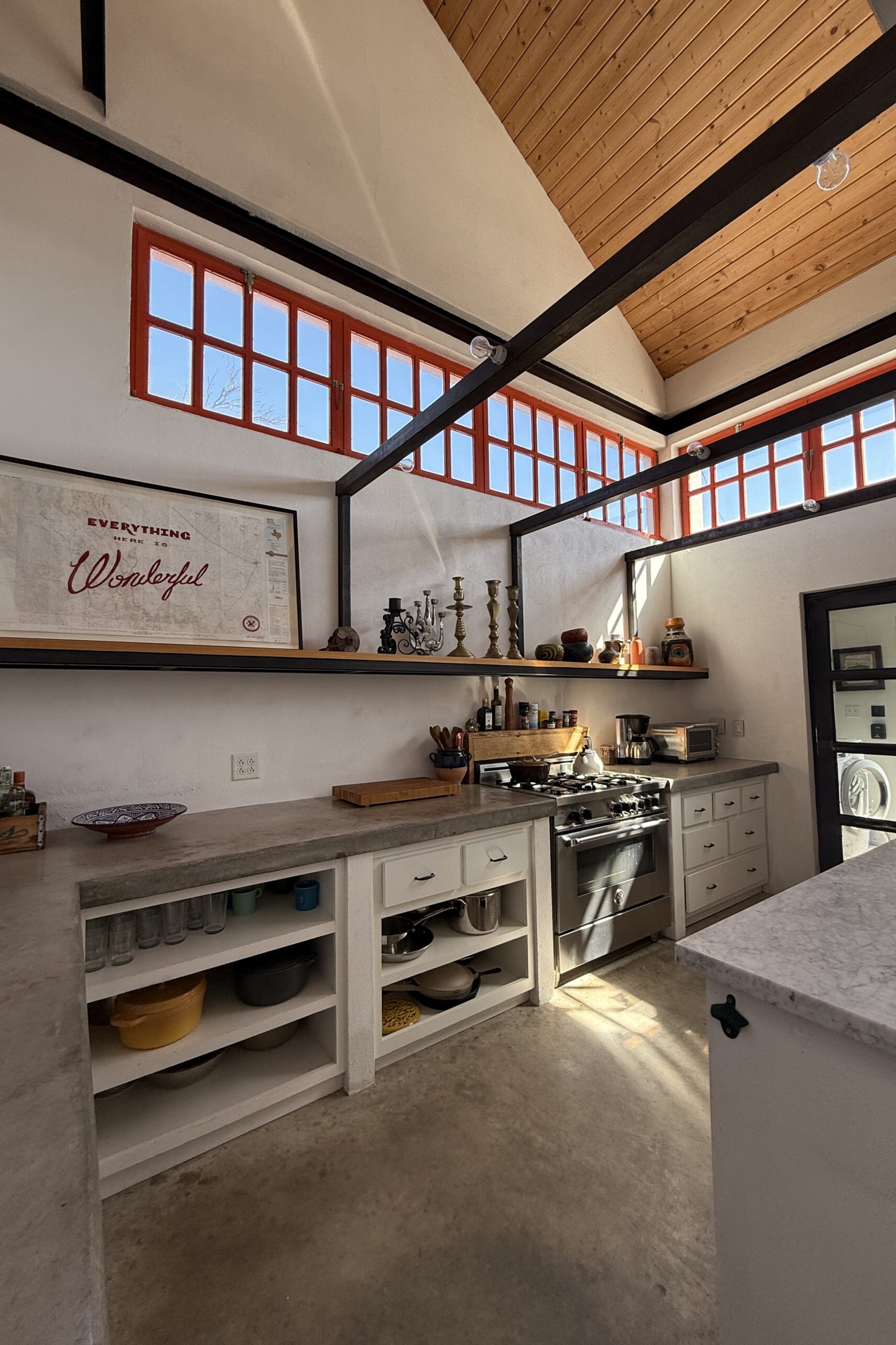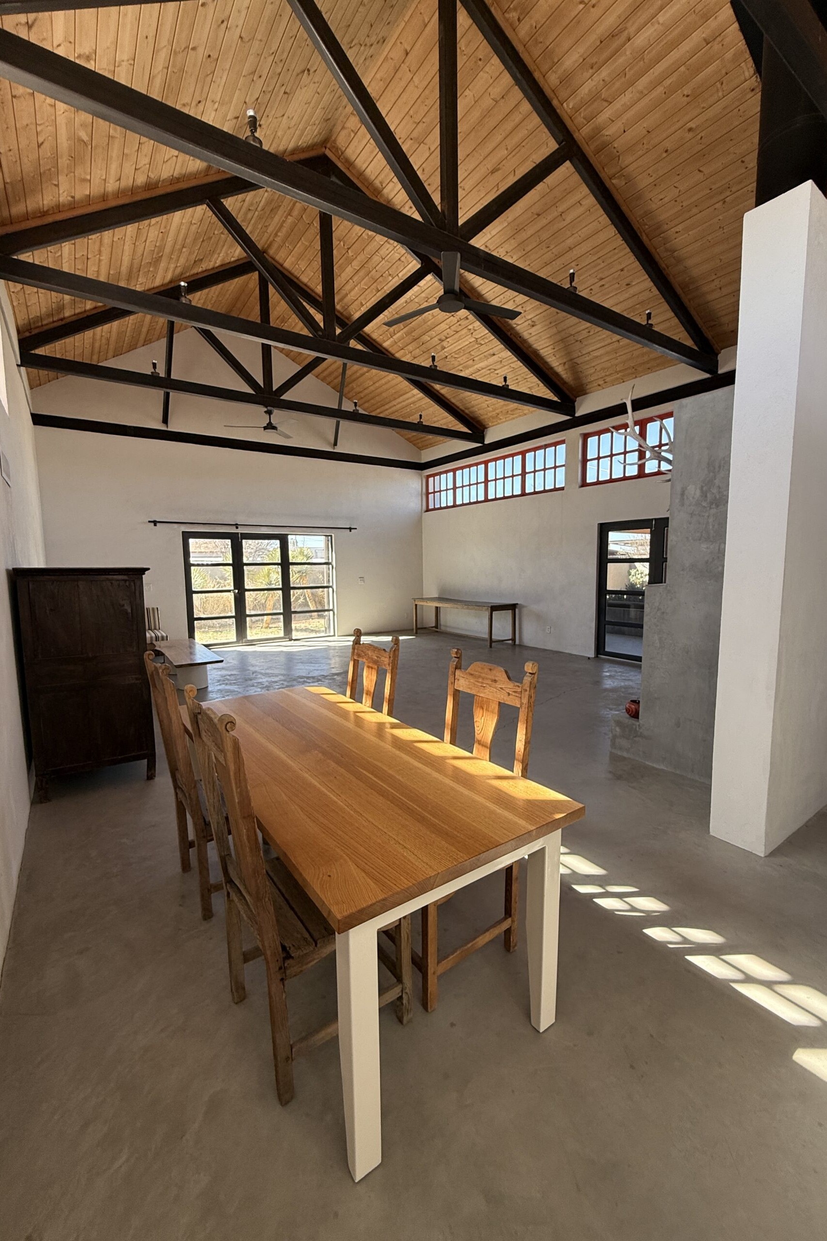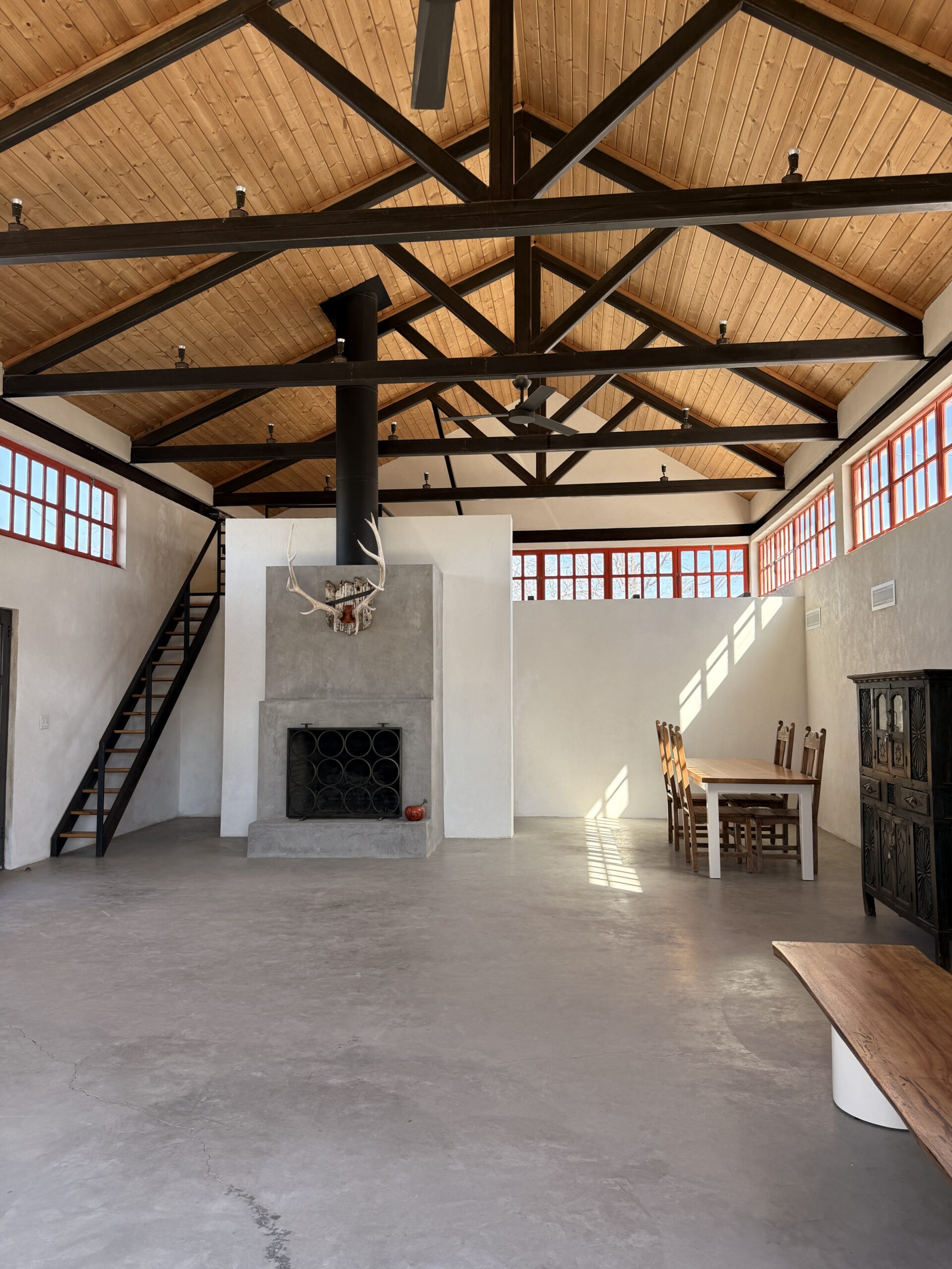 A full-size kitchen supports weddings, private dinners, and meaningful celebrations, while wide doors open to a spacious courtyard. Outdoors, guests gather around a large fire pit, dine beneath the pergola at a communal table for 20, or move easily between the courtyard and a screened-in porch suited for dining or seating. An outdoor wood-burning grill extends the gathering beyond the walls.