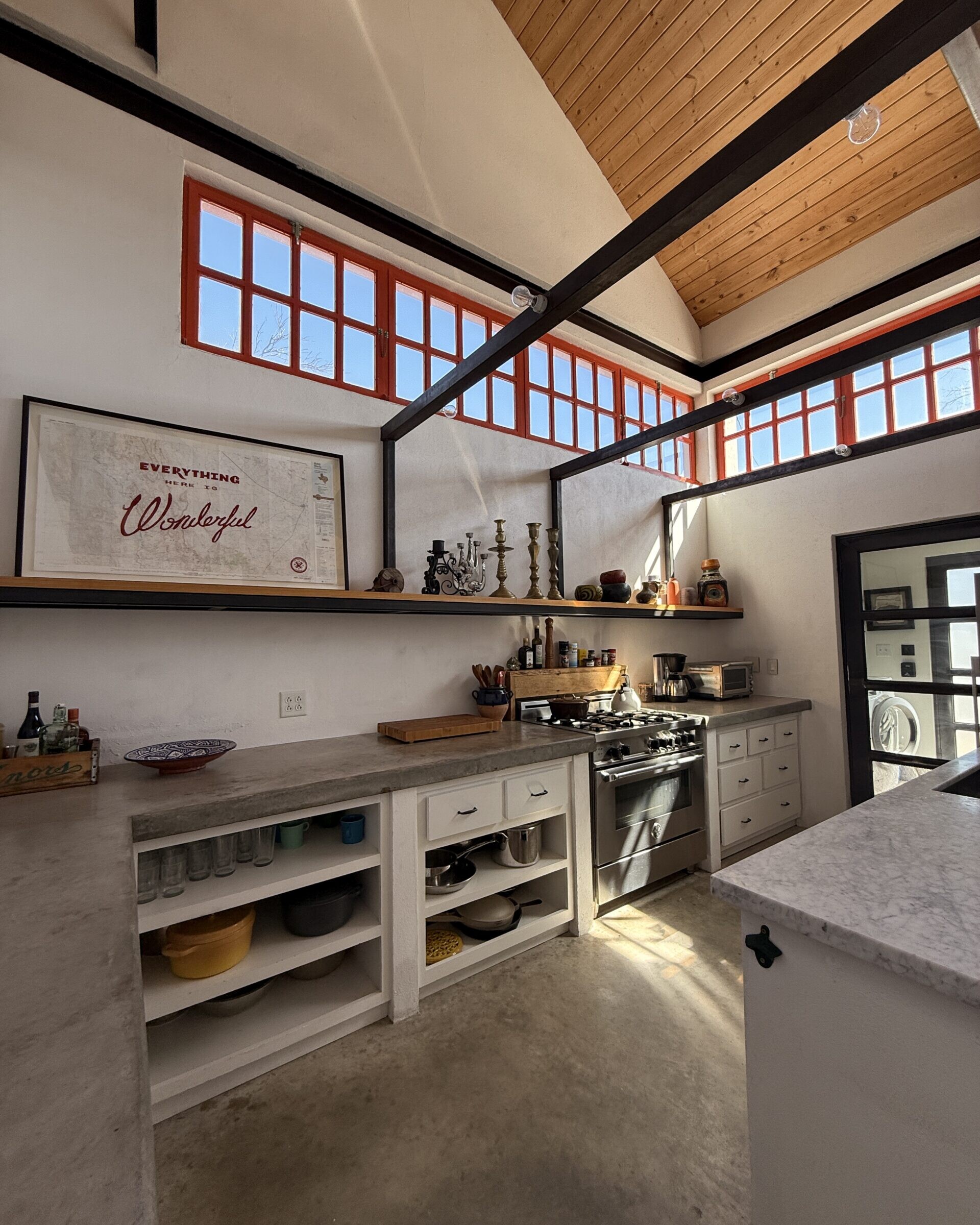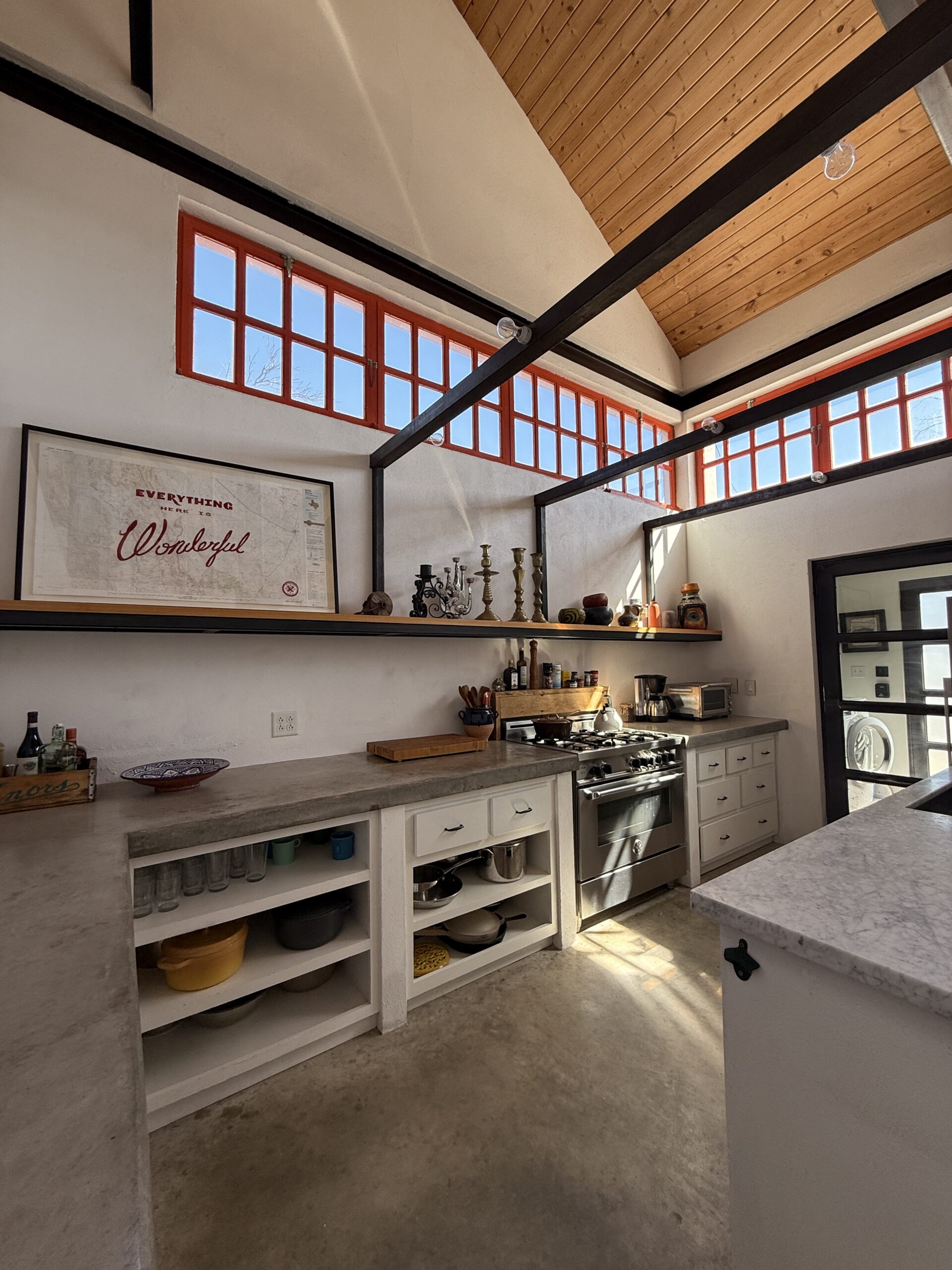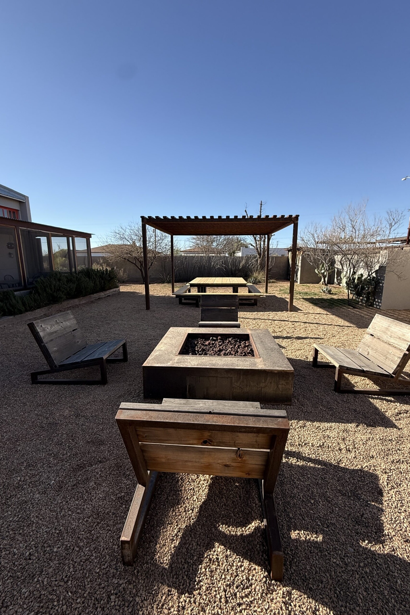 A full-size kitchen supports weddings, private dinners, and meaningful celebrations, while wide doors open to a spacious courtyard. Outdoors, guests gather around a large fire pit, dine beneath the pergola at a communal table for 20, or move easily between the courtyard and a screened-in porch suited for dining or seating. An outdoor wood-burning grill extends the gathering beyond the walls.