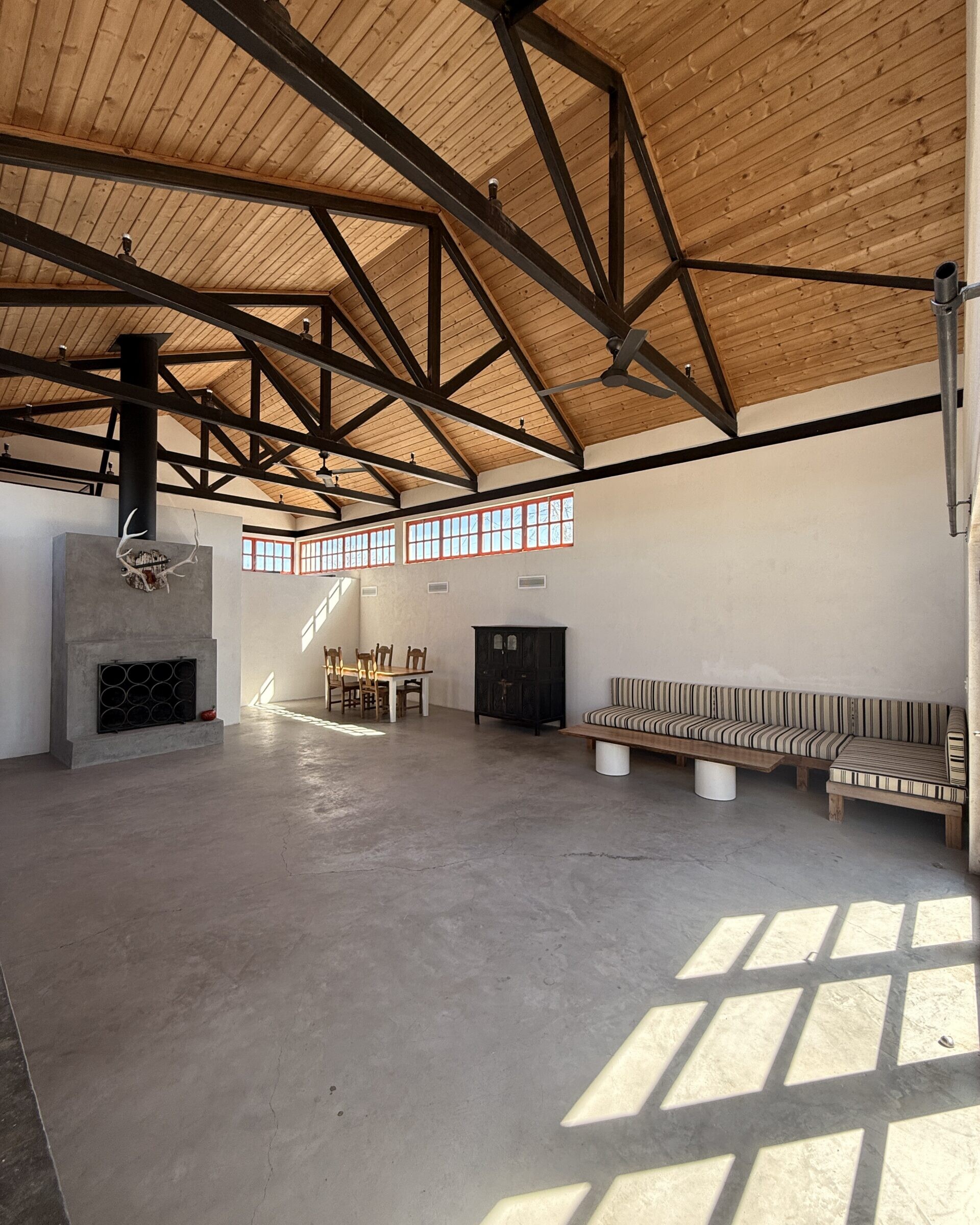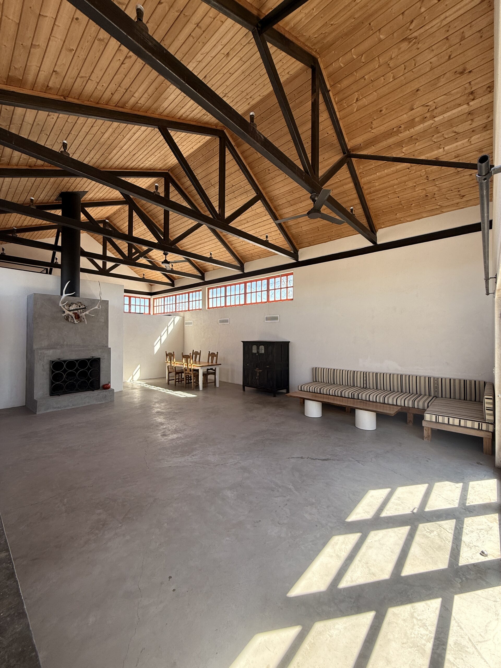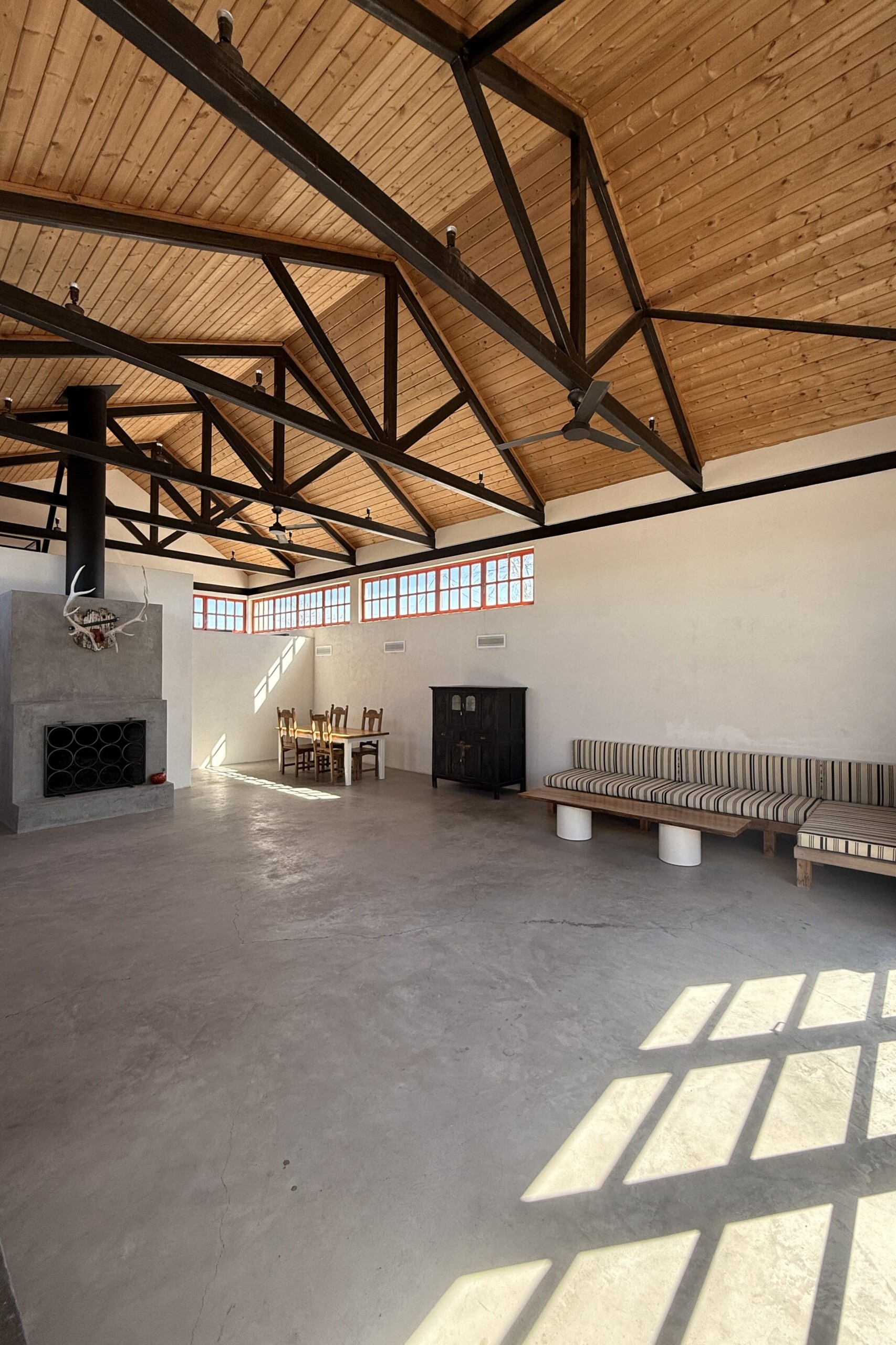 The 1,500-square-foot space features a lofted roof, a large fireplace, and steel casement windows that wrap the walls, filling the room with natural light and opening it to the surrounding desert landscape.